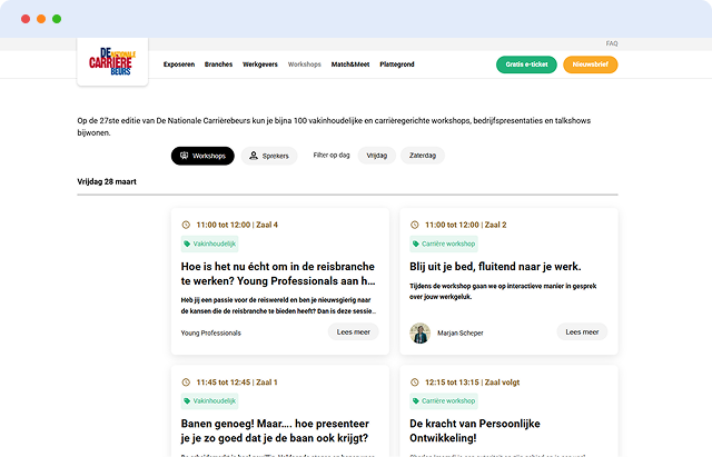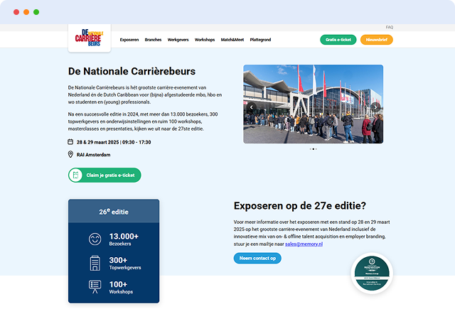 De vernieuwde website biedt een intuïtieve en gebruiksvriendelijke ervaring die bezoekers moeiteloos door het aanbod van werkgevers, workshops en Match & Meet-mogelijkheden leidt. Dankzij de moderne look and feel sluit de site perfect aan bij de verwachtingen van werknemers en werkgevers. Dit draagt bij aan een sterke online presentatie van De Nationale Carrièrebeurs en ondersteunt het succes van het event als dé ontmoetingsplek voor talent en topwerkgevers.