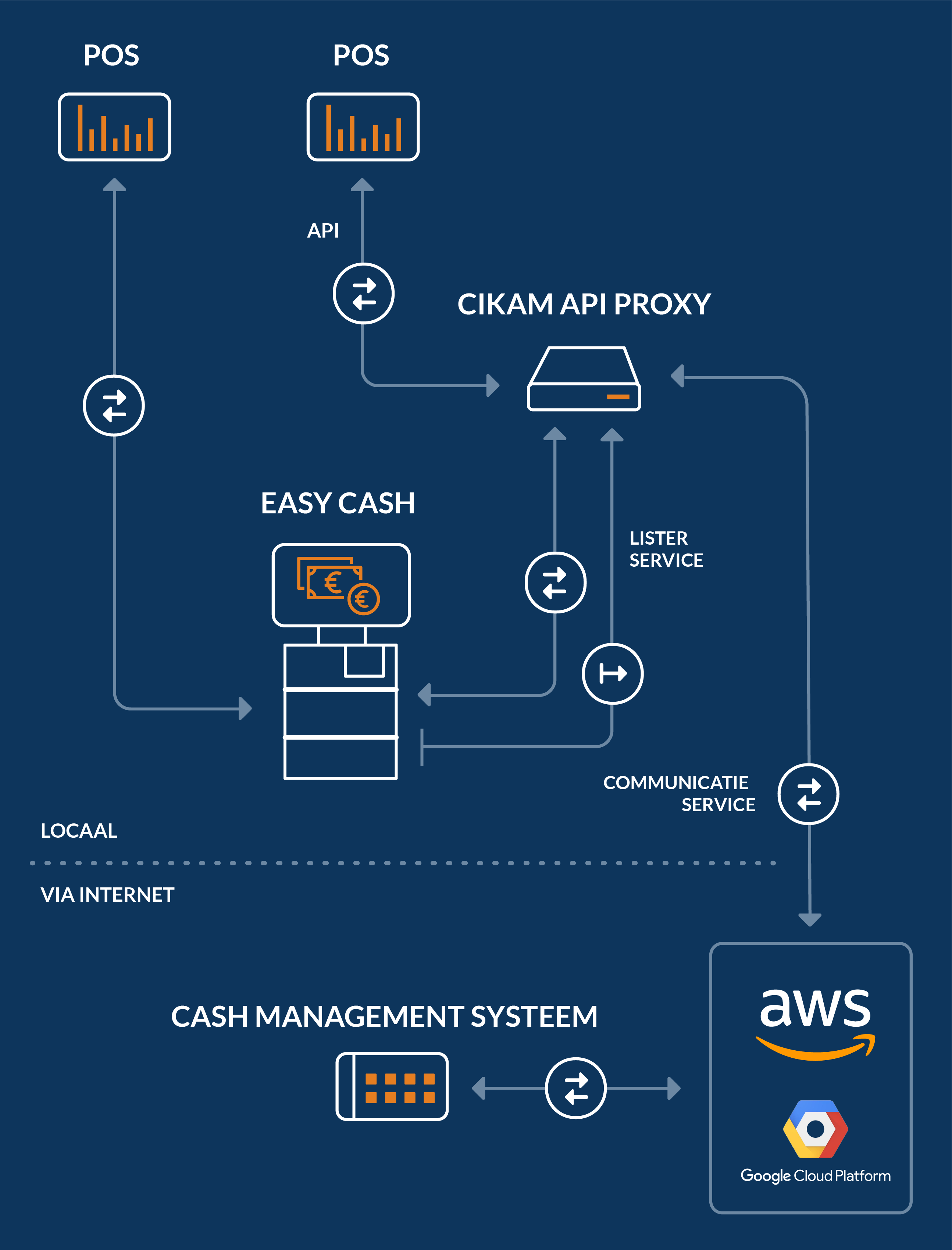 Om deze acties dan weer te kunnen uitvoeren is er weer een andere service gemaakt, welke alle communicatie vanaf de Proxy met de EasyCash Machine regelt en eventuele berichten van de machine opvangt om ze vervolgens door te geven aan de communicatie service, welke ze weer doorstuurt naar de cloud. Eenmaal in de cloud worden alle events verwerkt naar makkelijk leesbare transacties, welke het Customer Dashboard dan weer kan weergeven richting de gebruiker. Ook hebben we een programma gemaakt dat lokaal de functionaliteit van de Cikam EasyCash machines uitbreidt, namelijk een API met daarop een eigen betaal applicatie. De API is vooral bedoeld voor andere POS leveranciers om snel en makkelijk een koppeling te maken met de EasyCash machines. De betaal applicatie is gebouwd met het idee dat de klant eenvoudig zelf de betalingen moet kunnen doen, maar ondertussen zijn er behalve onze applicatie ook al heel wat externe POS leveranciers met de API gekoppeld.